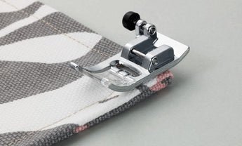 Standard trykkfot, spesiell til tykke stoffer da den har utjevningsknapp, bedre transport ved start av søm.